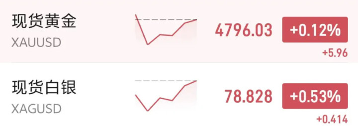 截至17日开盘,黄金白银短线拉升,现货黄金报4796美元/盎司,现货白银报78.8美元/盎司。